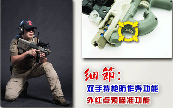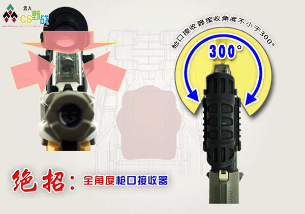 東莞真人CS野戰(zhàn)最新裝備DK3000"精靈"槍體前部獨(dú)立設(shè)計(jì)3面接收裝置,可以確保接收角度不小于300°,這為單槍戰(zhàn)斗模式做好了鋪墊。